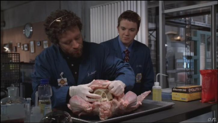 Zack és Hodgins a bogaras tudós és Angela összeköltözéséről csevegnek, közben pedig kísérlet gyanánt belegyömöszölnek egy koponyát egy pulykatetembe és keresztülpréselik egy rácson. Mindketten pulykahúsosak és kocsonyás anyagnak is nevezhető ambrózia-salátásak lesznek a fejük búbjáig, csakúgy, mint Cam, aki látszólag nem lesz boldogabb a ténytől, hogy így kiderül: az áldozatot nem a lelátó ölte meg, valaki többször fejbe verte, összezúzva a koponyáját.