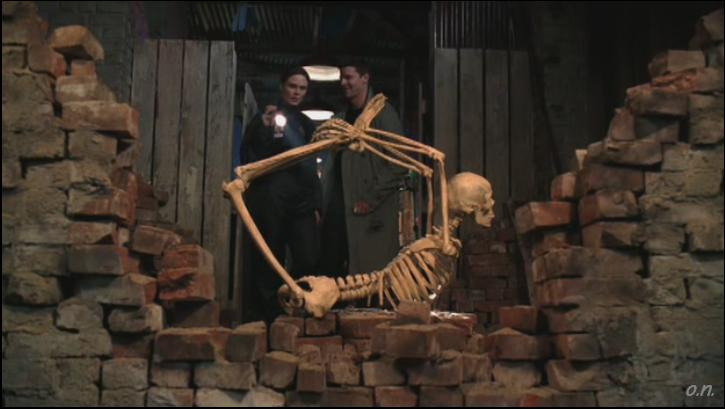 Ezúttal igazán érdekes eset várja hőseinket: a csontvázat karikába hajlították és mégsem esett szét. Bones jót nevet Booth találgatásán arról, hogyan is lehetséges ez, aztán az arcára fagy a mosoly, amikor jő Caroline és közli: felfüggesztették, kezdődik az apja tárgyalása és amíg véget nem ér, nem dolgozhat együtt azzal az emberrel, aki a letartóztatást végezte. Booth kap az alkalmon, hogy nem társak és gyorsan megköszöni Sweets-nek az eddigi partnerterápiát. Így, hogy már nem a paciense, még egyet is ért vele, nevezetesen épp abban, hogy Bones hideg tárgyilagossága csak elfedi a fájdalmát, amit nyilván érez. Nagyjából az összes munkatársa az apját akarja börtönbe juttatni, még Sweets is, aki a pszichológiai profilt készítette. A nő persze hárít, ő jól van, kösz.