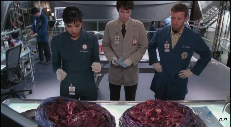 Cam, Hodgins és Vincent sokat láttak már, de most mégis döbbenten állnak a két zsáknyi trutymó fölött, a gyakornok rögtön leveszi, hogy rá vár a zsákok kiürítésének nemes feladata. Mindössze egy csésze teát kér, ha majd végez. Hodgins megkönnyíti kicsit a munkáját, mert kiszed az egyik zsákból két darabkát: az egyik aranynak, a másik valamiféle gyöngynek tűnik. Mivel sem a sumérok, sem a déltengeri törzsek nem darabolták fel a halottaikat a temetés előtt apró cafatokra, Vincent vesz egy nagy levegőt, és hozzálát a hamupipőkés válogatósdihoz.
