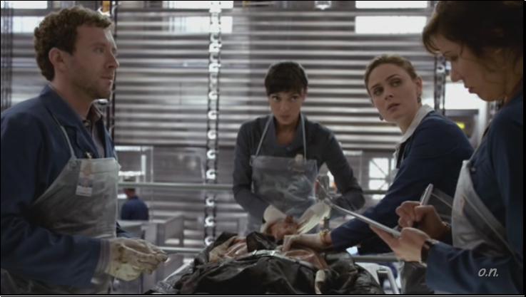 A kocsihoz kiérkezve Bones elemez: „felszíni sérülések az elülső baloldali részeken”, Booth fordít: „karcolások a lökhárítón”, haha. De az autó tényleg vérzik, vagyis inkább a csomagtartójában található hulla, ami a jelentős hőhatásnak köszönhetően eléggé gusztustalanul folyik szét. Egy Walther PPK-t és egy CIA-s igazolványt azért kihalásznak mellőle, úgy tűnik, Sweetsnek igaza volt, ezt még Bones is kénytelen elismerni. Boncolás közben Cam körbekérdezi a kis csapatot, nem tudnának-e segíteni Wendellnek. Angela rögtön javasolja is Brennannek, hogy hozzon létre ösztöndíjat, de az antropológusnő már támogat jónéhány segélyszervezetet, és rég megtanulta már, hogy ne kötődjön a gyakornokokhoz, hiszen még a legjobbak is okozhatnak csalódást. Cam benne van egy bizottságban, ami ösztöndíjakat ad, csak éppen középiskolásoknak, nem nyert. Hodgins alapítványánál pedig befagyasztották a tőkét a válság miatt. Angie meg szimplán csóró, még az ebédjét is otthonról hozza.